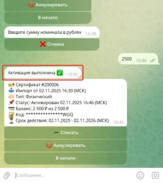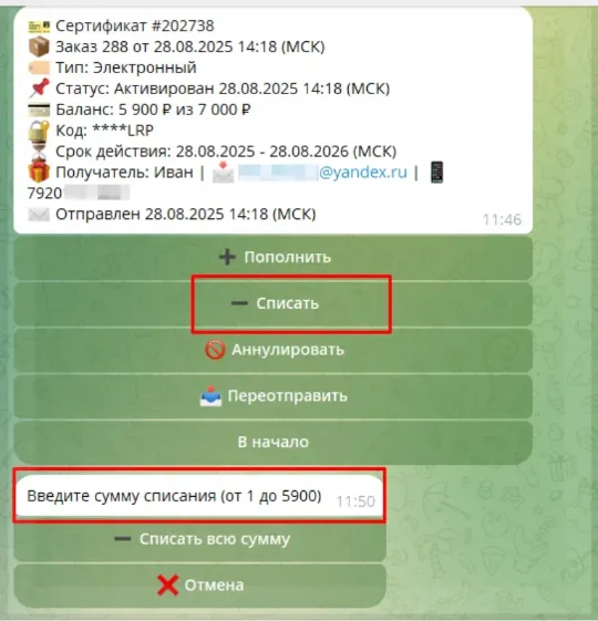 В карточке сертификата нажмите кнопку Списать. Бот ответит запросом: Введите сумму списания (от... до...).
