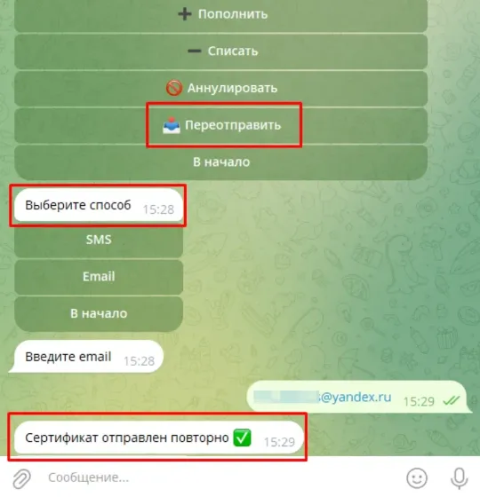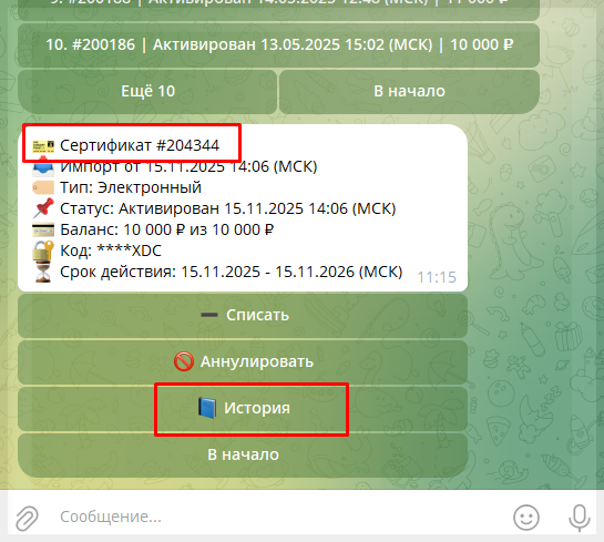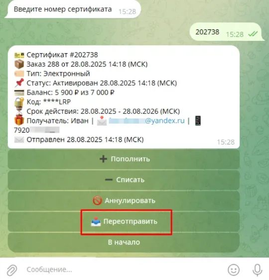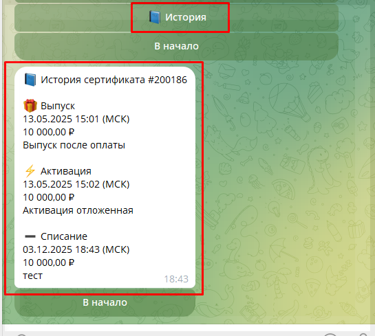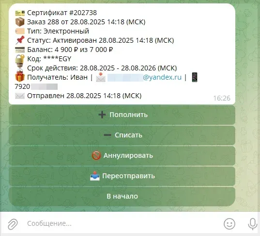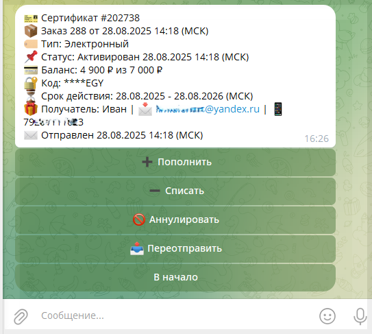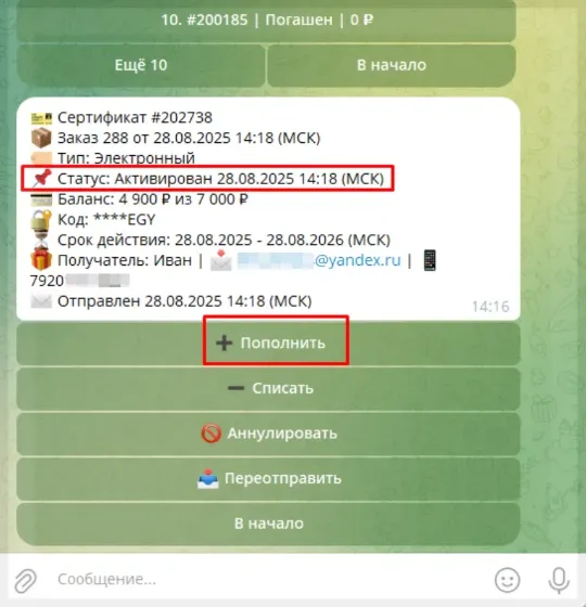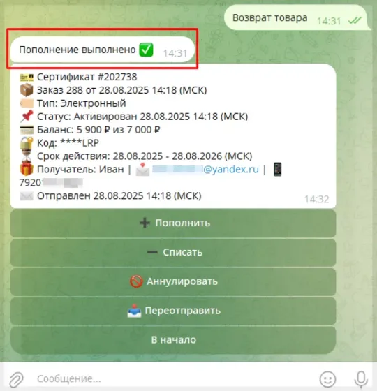 После подтверждения бот сообщит об успешном выполнении операции Пополнение баланса и выведет обновлённую карточку сертификата.