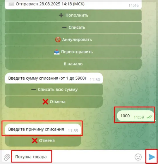 После ввода суммы бот предложит ввести причину списания или отменить операцию.