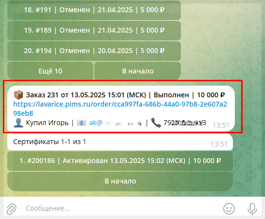 - Статус: Новый / Отменён / Выполнен (сертификаты отправлены или запланирована отправка)