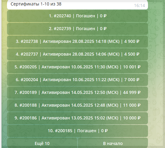 По вашему запросу бот найдёт подходящие сертификаты и отобразит первые 10 в виде списка. Если сертификатов больше 10, под списком появится кнопка Ещё для отображения следующих 10 записей. Кнопка будет доступна до тех пор, пока вы не переберёте все найденные сертификаты.