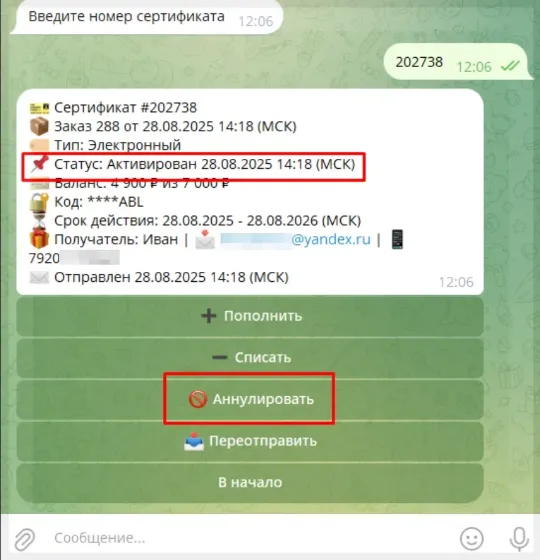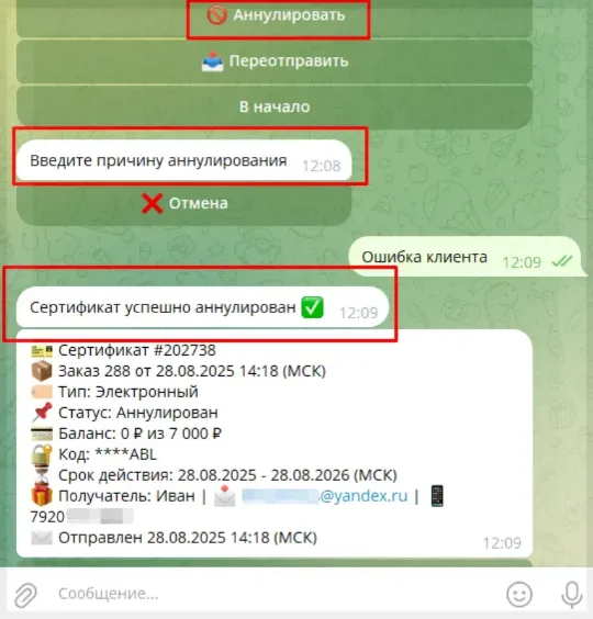 После подтверждения бот пришлет вам уведомление об успешном аннулировании и выведет обновлённую карточку сертификата.