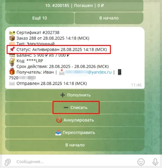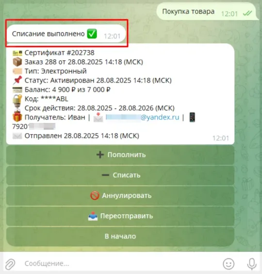 После подтверждения бот сообщит об успешном выполнении операции Списание и выведет обновлённую карточку сертификата.