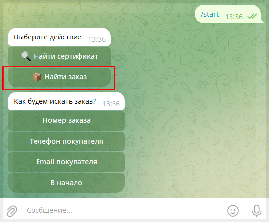 Для поиска заказа нажмите кнопку Найти заказ в главном меню бота и выберите параметр поиска: