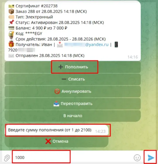 В карточке сертификата нажмите кнопку Пополнить. Бот ответит запросом: Введите сумму пополнения (от... до...).