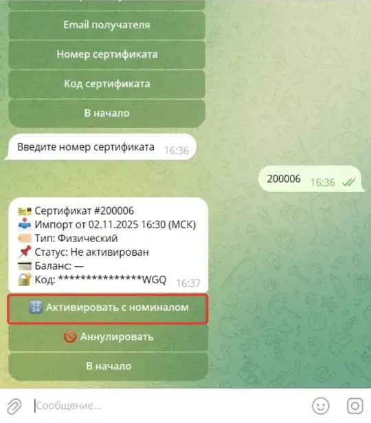 Для активации найдите необходимый сертификат в боте, например, по его номеру. Если сертификат есть в системе, откроется его карточка со статусом Не активирован.