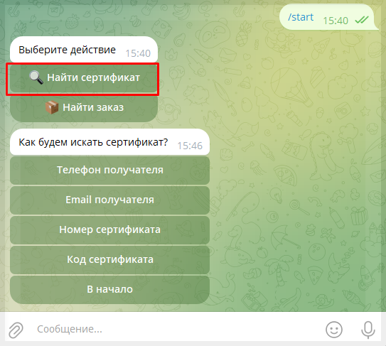 Для поиска сертификата нажмите кнопку Найти сертификат в главном меню бота и выберите параметр поиска: