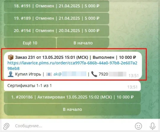 Бот позволяет быстро находить и просматривать информацию о заказах, оформленных через подарочную витрину GetPrime. Это удобно, когда у вас есть номер заказа, телефон или email покупателя.