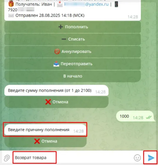 После ввода суммы бот предложит ввести причину пополнения или отменить операцию.