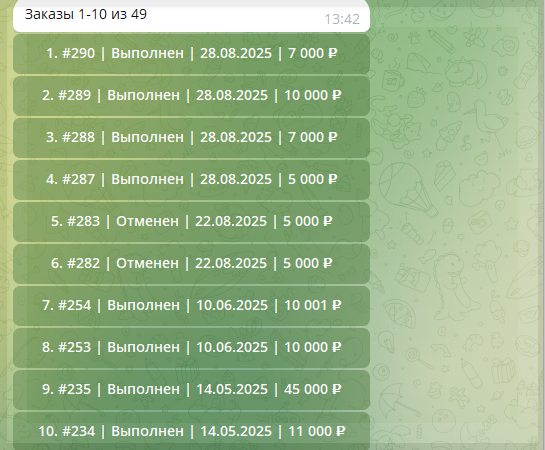 По вашему запросу бот найдёт подходящие заказы и отобразит первые 10 в виде списка. Если заказов больше 10, под списком появится кнопка Ещё для отображения следующих 10 записей. Кнопка будет доступна до тех пор, пока вы не переберёте все найденные заказа.